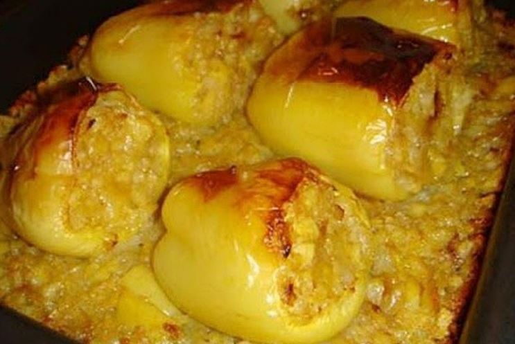 Preko krumpira staviti tanki sloj nadjeva, pa složiti paprike. Nadjev staviti i između paprika. Preliti sačuvanom tekućinom od nadjeva, paprike malo poprskati uljem i staviti peći na 200 C oko 1,5 sat. Koji put okrenuti paprike da porumene sa svih strana.