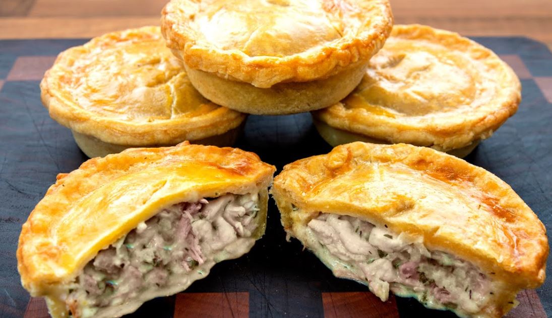 Priprema: U šerpu sipajte vodu i kada provri dodajte masti i puter i kuvajte dok se ne otopi. U posudi pomešajte brašno i so i promešajte, pa sipajte mast. Umesite testo i podelite ga na 2 jednaka dela. Umotajte u providnu foliju (svako testo zasebno) i stavite u frižider na minimum 2 sata. U šerpi istopi puter, pa dodajte sitno seckano belo meso. Posolite i pobiberite, pa pospite majčinom dušicom. Promešajte, pa dodajte mleveni beli luk, a posle 2 minuta i seckane pečurke. Posle 5 minuta dodajte brašno i sipajte sirće. Lepo promešajte i posle 5 minuta sipajte bujon (kocku supe rastovrite u 200 ml vrele vode) i pavlaku za kuvanje, pa opet promešajte. Kada krene da ključa dodajte rendanu šunku i seckani peršun promešajte i isključite šporet. Ohladite na sobnoj temepraturi, pa stavite u frižider. Testo razvucite na pobršanjenoj površini i čašom ili okruglim kalupom vadite oblike. U mali kalup koji ste premazali uljem stavite testo tako da pokrije i ivice. Lepo utisnite, pa sipajte nadev. Umutite jaje i premažite ivicu i preko stavite drugi krug testa koji ste isto po ivici premazali jajetom i tom stranom stavili preko pite. Tako radite dok ne utrošite sve. Celu pitu premažite umućenim jajetom, pa zasecite na sredini na 2 mesta. Pecite u zagrejanoj rerni na 200°C oko 40 minuta.