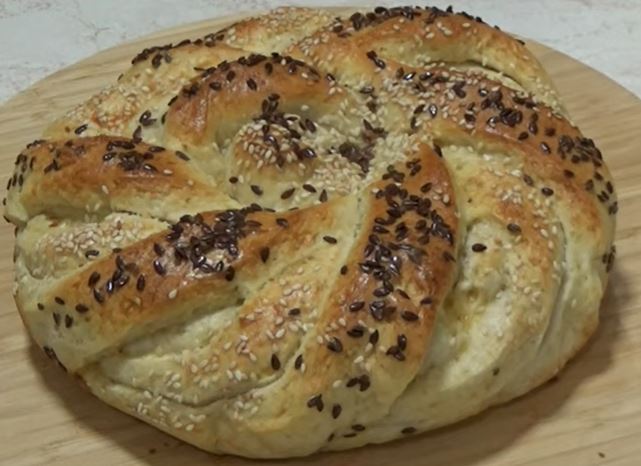 U okrugli kalup prečnika 22 cm na papir za pečenje staviti pogaču. Pogaču pokriti kuhinjskom krpom i ostaviti da malo naraste. Umutiti jaje, dodati kašiku mleka i umutiti. Ovim premazati naraslu pogaču. Posuti pogaču semenkama lana i susama. Pogaču staviti u zagrejanu rernu na 200 stepeni da se peče oko 20 minuta, zavisi od rerne.