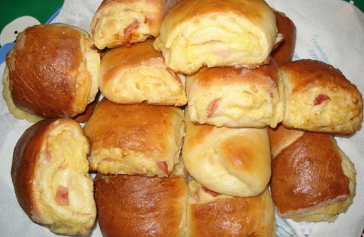 U međuvremenu mikserom izmutiti fil. Svaku četvrtinu tijesta dobro razvaljati i namazati filom te preko njega posuti narendanom šunkom i sirom.