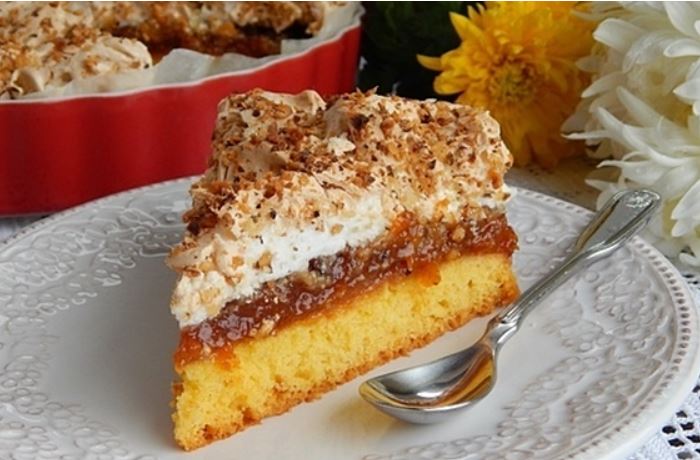 Za to vreme, pekmez od kajsija ugrejati ukoliko je gust, kako bi se lakše rasporedio po kori. Belanca umutiti u čvrst sneg, dodajući sok od limuna i šećer. Mutiti oko 5 minuta na najjačoj brzini.