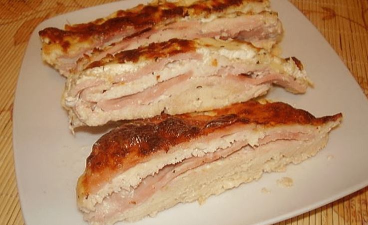Poredjati suvi vrat, opet premazati senfom, sada poredjati kackavalj u listicima. Izmutiti jaja i pavlaku i preliti preko kackavalja.