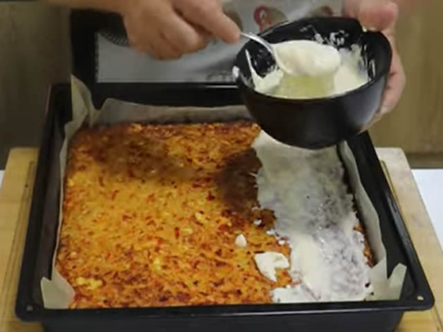 1 jaje sa 3 kašike kiselo mleko ili kisela pavlaka. Vratiti u rernu na još 5-10min.