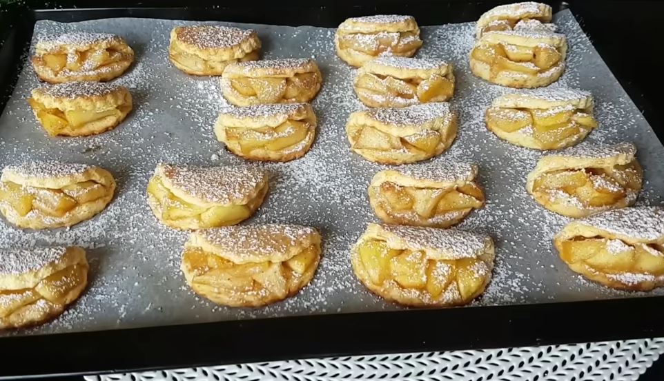 Lagano sipajte prašak za pecivo i brašno, pa mešajte dok ne dobijete glatko testo, koje ćete potom zamesiti rukama. Razvucite što tanje oklagijom, pa okruglom modlom ili čašom vadite krugove kao za krofne. Svaki od njih napunite sa kašičicom nadeva od jabuke, pa ih lagano preklopite, ali nemojte skroz zatvarati. Poređajte ih na pleh obložen pek papirom i pecite na 180 C 15-20 minuta. Pre služenja ih po želji pospite šećerom u prahu.