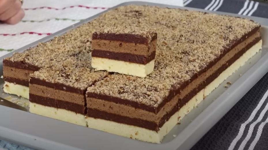 Dok se kore peku možete da pripremite fil. Puter, šećer i čokoladu stavite u šerpu, pa zagrevajte na umerenoj vatri dok se potpuno ne rastopi. Vodite računa da često mešate da vam ne zagori. U rastopljenu smesu dodajte mlevene orahe i sve lepo sjedinite. Na tacnu prvo stavite svetlu koru, zatim je premažite jednom polovinom fila. Preko stavite tamnu koru i premažite je ostatkom fila. Kolač po želji pospite mlevenim orasima. Kada se prohladi secite ga na kocke i služite.