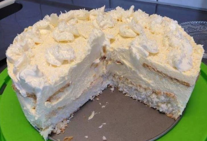 Na biskvit stavite pola kreme, zatim posložite kekse koje ste umočili u smjesu mlijeka i maraskina. Prekrijte ostatkom kreme. Tortu pospite kokosovim brašnom.
