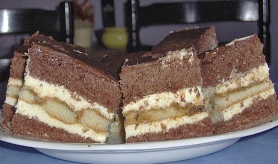 Staviti drugi dio biskvita preko kojeg namažemo tanki sloj kreme i prelijemo čokoladnom glazurom.