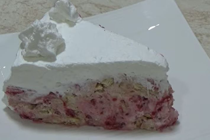 Pomešati kiselu pavlaku sa šećerom u prahu. Umutiti slatku pavlaku. Dodati kiselu pavlaku pomešanu sa šećerom i umutiti. Keks izlomiti, preliti mlekom i sačekati da upije. Dodati umućenu pavlaku u keks i izmešati. Dodati mleveni keks i dobro izmešati. Dodati zaleđene maline i polako izmešati.