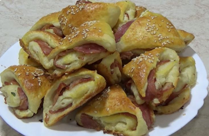 Trouglove poređati u pleh na papir za pečenje. Umutiti jaje i premazati trouglove. Posuti susamom po želji. Trouglove staviti u zagrejanu rernu na 200 stepeni da se peku od 15 do 20 minuta.