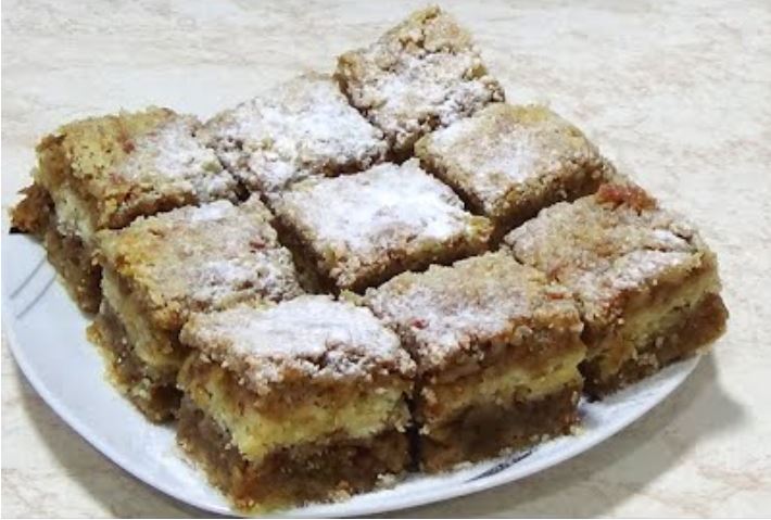 U podmazan pleh (25 x 35 cm) sipati i rasporediti 2 čaše suve smese. Preko toga rasporediti polovinu fila. Potom opet sipati 2 čaše suve smese. Zatim rasporediti drugi deo fila. Sipati preostalu suvu smesu. Na kraju preliti istopljenim margarinom. Staviti u rernu zagrejanu na 180 stepeni i peći 40-45 minuta.