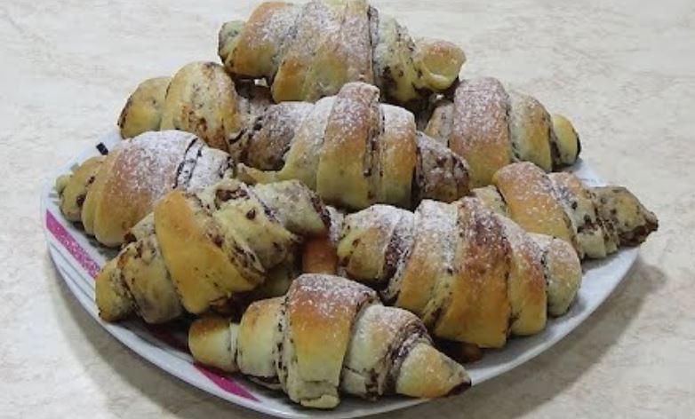 Zatim testo podeliti na dva dela. Jedan deo rastanjiti, pa narendati odozgo pola margarina. Onda narendati polovinu čokolade. Koru uviti u rolat, a rolat zaviti u obliku puža i ostaviti da odstoji. Isto uraditi sa drugim delom testa. Zatim rastanjiti prvi deo testa (prvog puža) na tanko. Iseći na 16 trouglića. Svaki trouglić zamotati u kiflicu. Kiflice ređati u pleh na pek papir i ostaviti da narastaju pola sata. Ponoviti isto sa drugim delom testa. Kroasane peći na 180 stepeni 15-20 minuta.