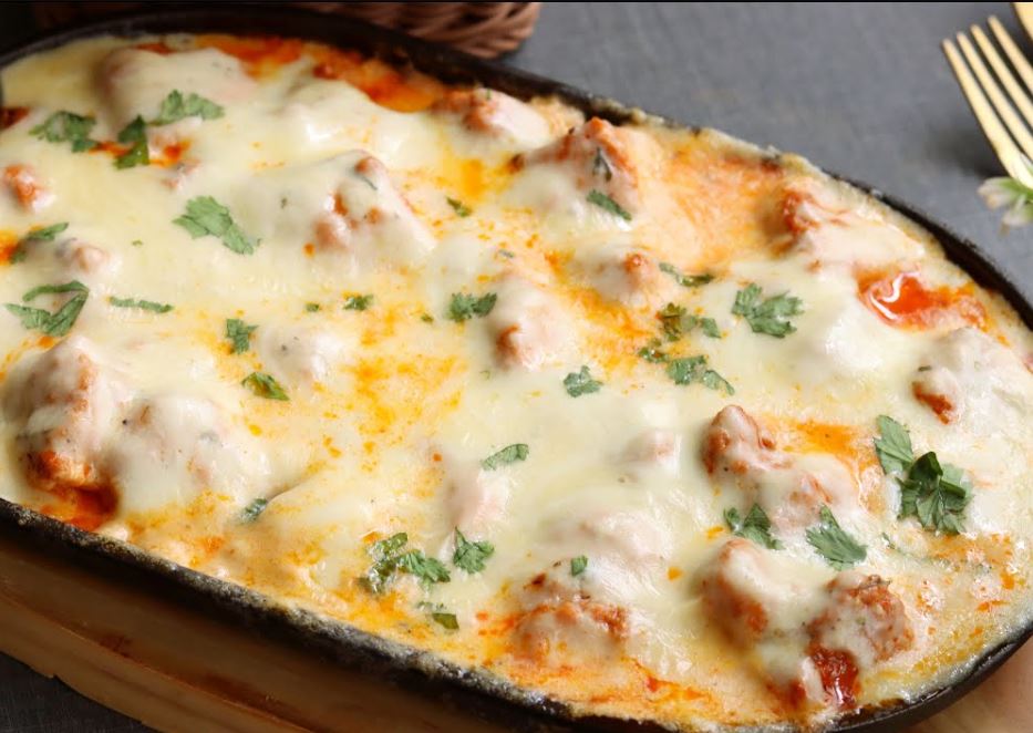 Piletinu posložite u tepsiju, prelijte preko nje bešamel sos koji ste napravili od maslaca, brašna, mleka, soli i peršuna. Pa preko bešamela stavite neki kačkavalj ili mocarelu i zapecite kratko u rerni.