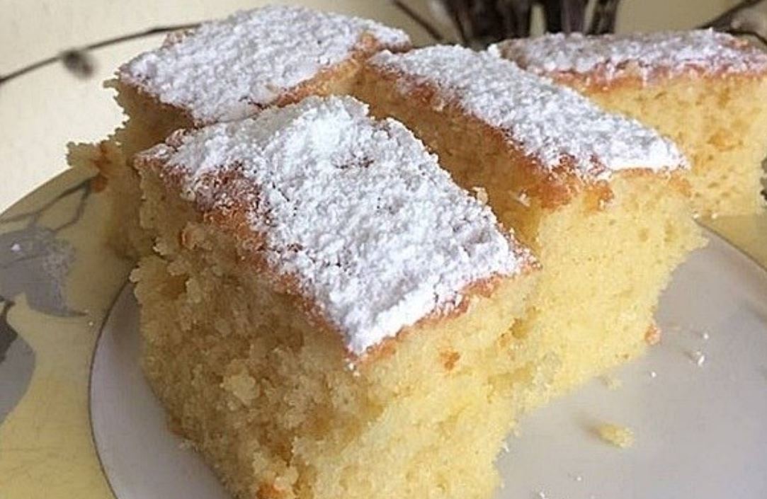 Dobro umutiti jaja i secer – dodavati postepeno ostale sastojke. Staviti u podmazan pleh 20×30 i peci na 180° oko 25-30 minuta. Posuti secerom u prahu, izrezati kockice i uzivati u ovoj pahuljici zute boje…