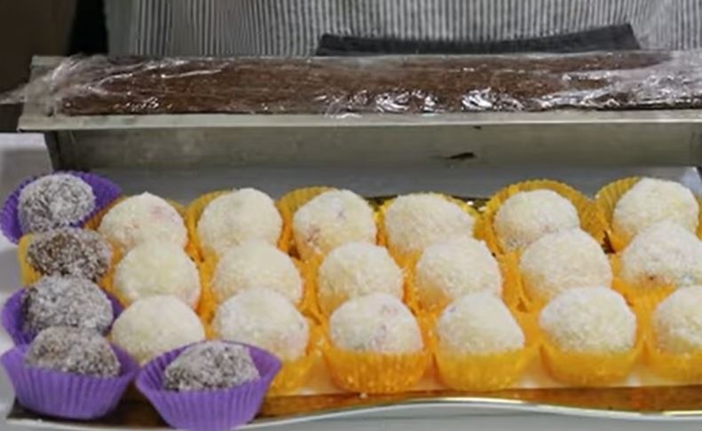 Od polovine smese napravite bombice i uvaljajte u kokos