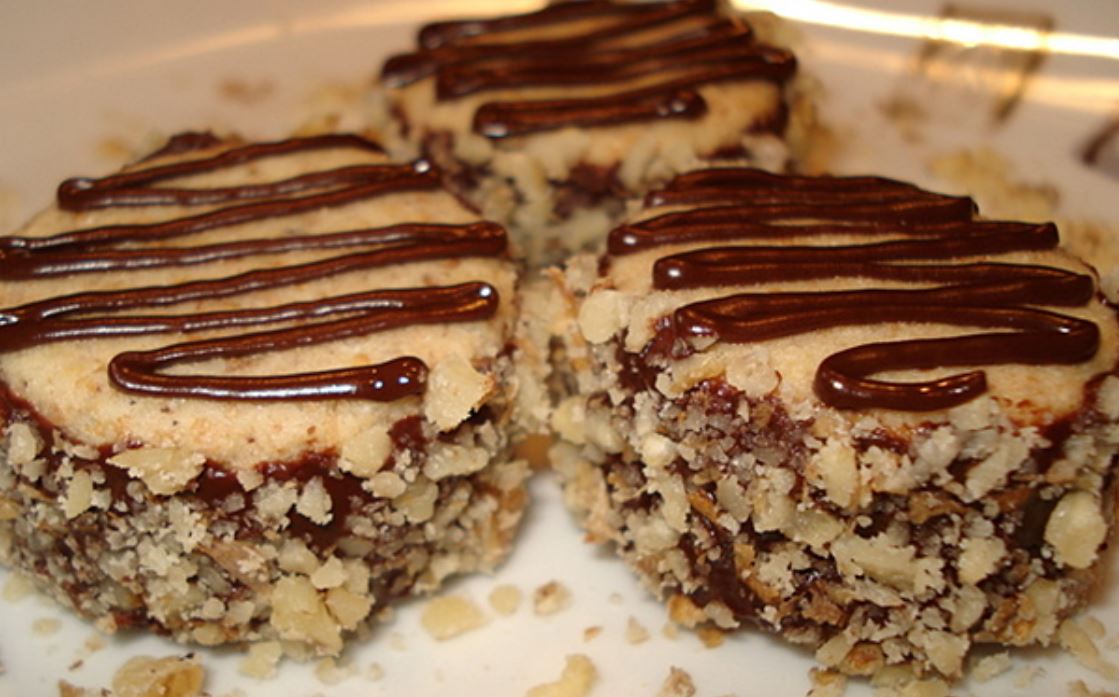 Zatim kistom lagano uokolo fila keksiće natapkajte topljenom čokoladom i uvaljajte u krupnije mljevene orahe. Po želji ih po gornjem dijelu prošarajte čokoladom i stavite kratko u frižider da se rashlade i fil stegne.