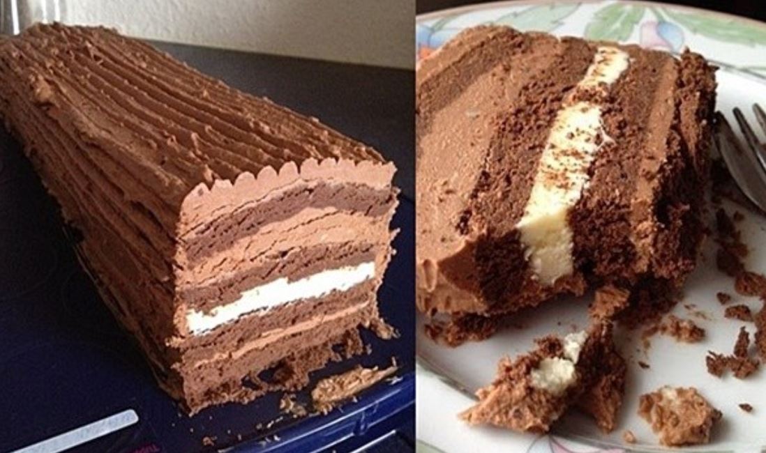 Jednu trecinu odvojiti (to je fil kroz sredinu), a u rest staviti otopljenu tamnu cokoladu (par minutaohladiti), izmiksati, pa namazati prvu i trecu traku i ukrasiti stangle okolo.