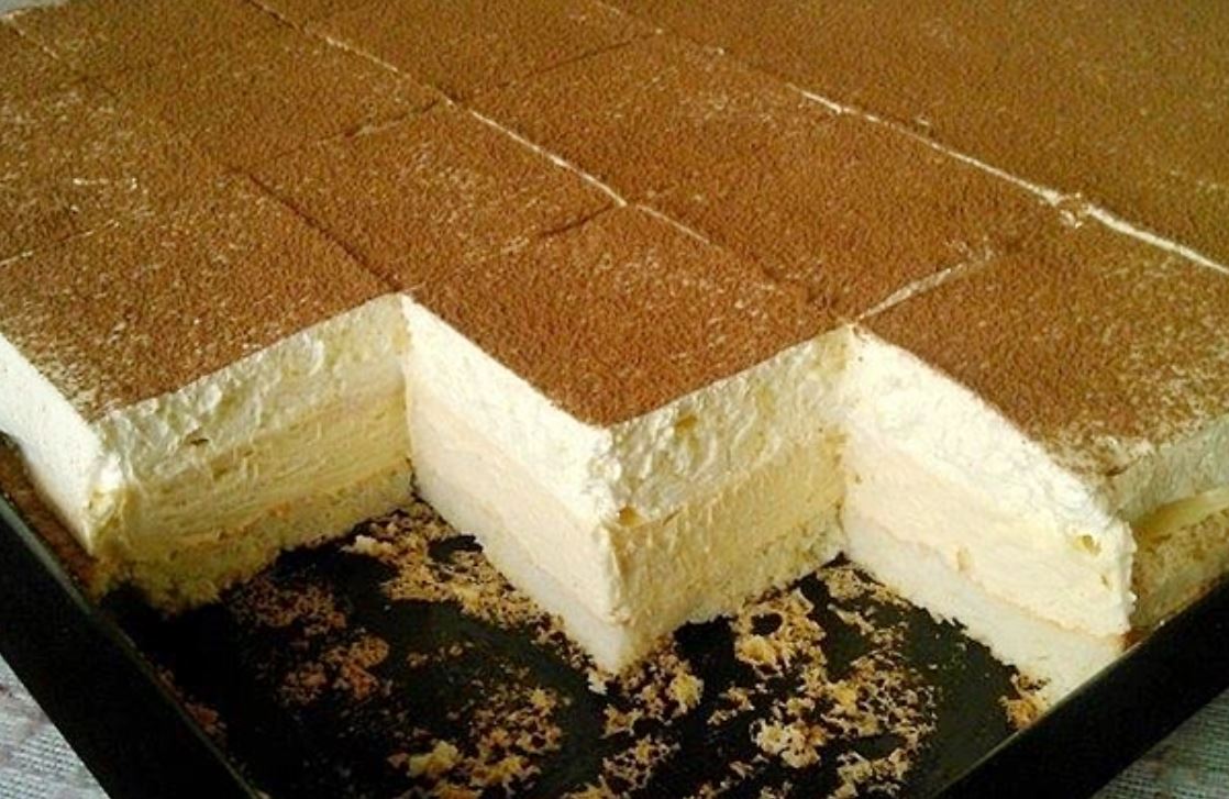 Peći na 180 C da blago porumeni 15-ak minuta. Vruć biskvit preliti hladnim mlijekom i ostaviti da se ohladi. Za kremu u malo hladnog mlijeka umutiti žumanca, sipati brašno i umutiti, dodati još mlijeka da smjesa bude rijetka. Ostatak mlijeka i šećer staviti da prokuva pa sipati smjesu od žumanaca i brzo miješati dok se ne zgusne, ostaviti da se ohladi, povremeno promiješati.