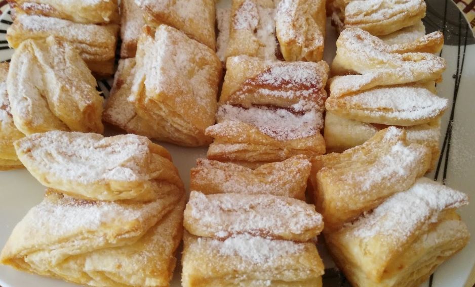Kad je treći put namazano i odmaralo razviti ga što tanje i seći po želji ( ja sam sekla pravougaonike) stavljati džem presaviti i pritisnuti prstom ispod džema malo da džem ne iscuri.