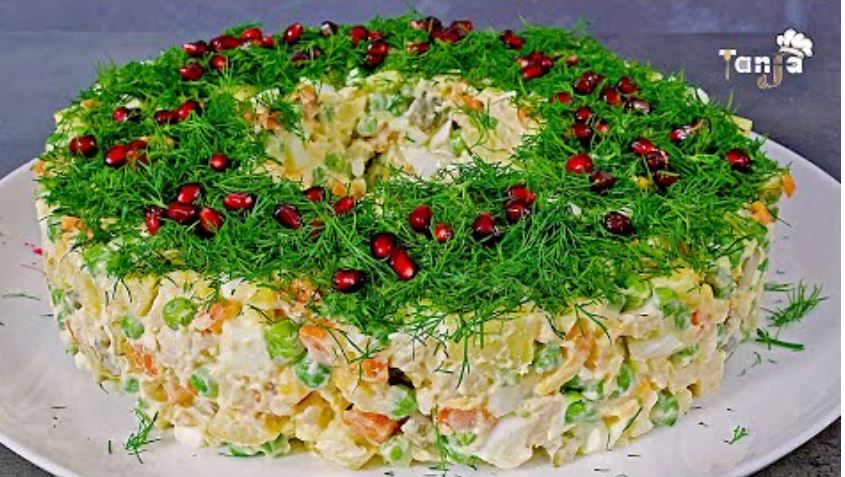 Recept za novogodišnju salatu. Salata sa piletinom, krompirom, graškom, šargarepom, majonezom i jajima. Ova salata je bolja od ruske salate i momoza salate! Slavlje može da počne, deca i gosti će biti oduševljeni. Salata ide savršeno uz ručak ili večeru sa mesom! Recept za torta salatu!