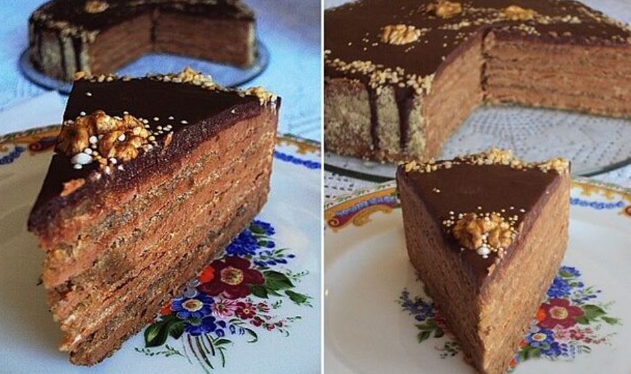 Kada ste sve kore naredali cijelu tortu omažite, stranice torte pospite mljevenim orasima i na kraju prelijte čokoladnom glazurom, ukrasite orasima.