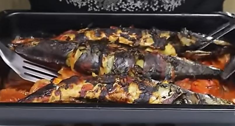Skušu odstajalu u marinadi dodatno napunite limunom i peršunom pa stavite preko povrća. Potrebno vam je nekoliko paprika, crni luk i paradajz sos.