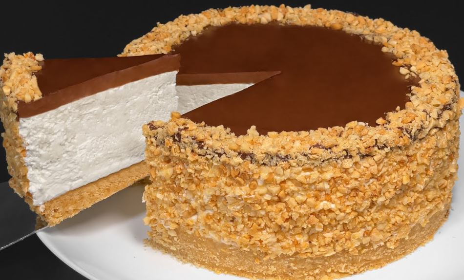 Sipajte preko keksa i lepo poravnajte. Istopite čokoladu sa slatkom pavlakom, pa prelijte preko fila. Ivicu pokrijte sekcanim kikirikijem i stavite u frižider da se stegne. Skinite obruč i tortu obložite seckanim kikirikijem.