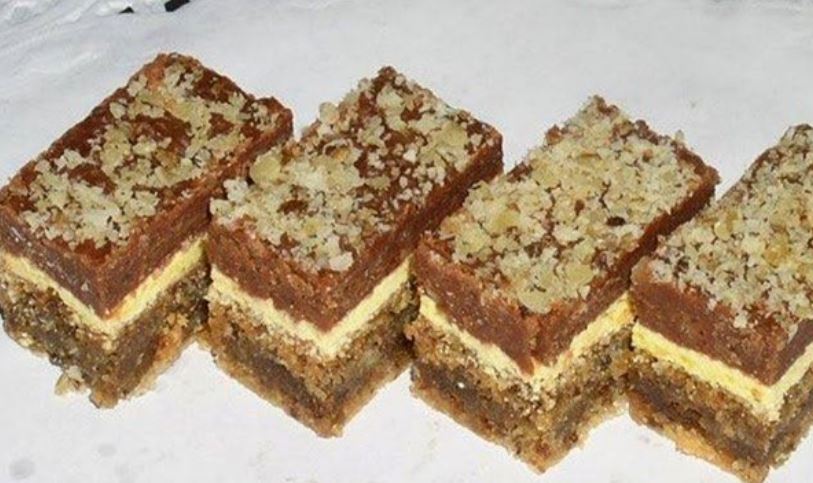 Crni fil sve prokuvati i preliti preko ohlađenog kolača, posuti mlevenim orasima.