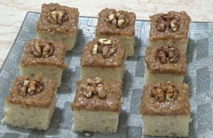 Kolač iseći na kocke i svaku kocku dekorisati polovinom jezgra oraha.
