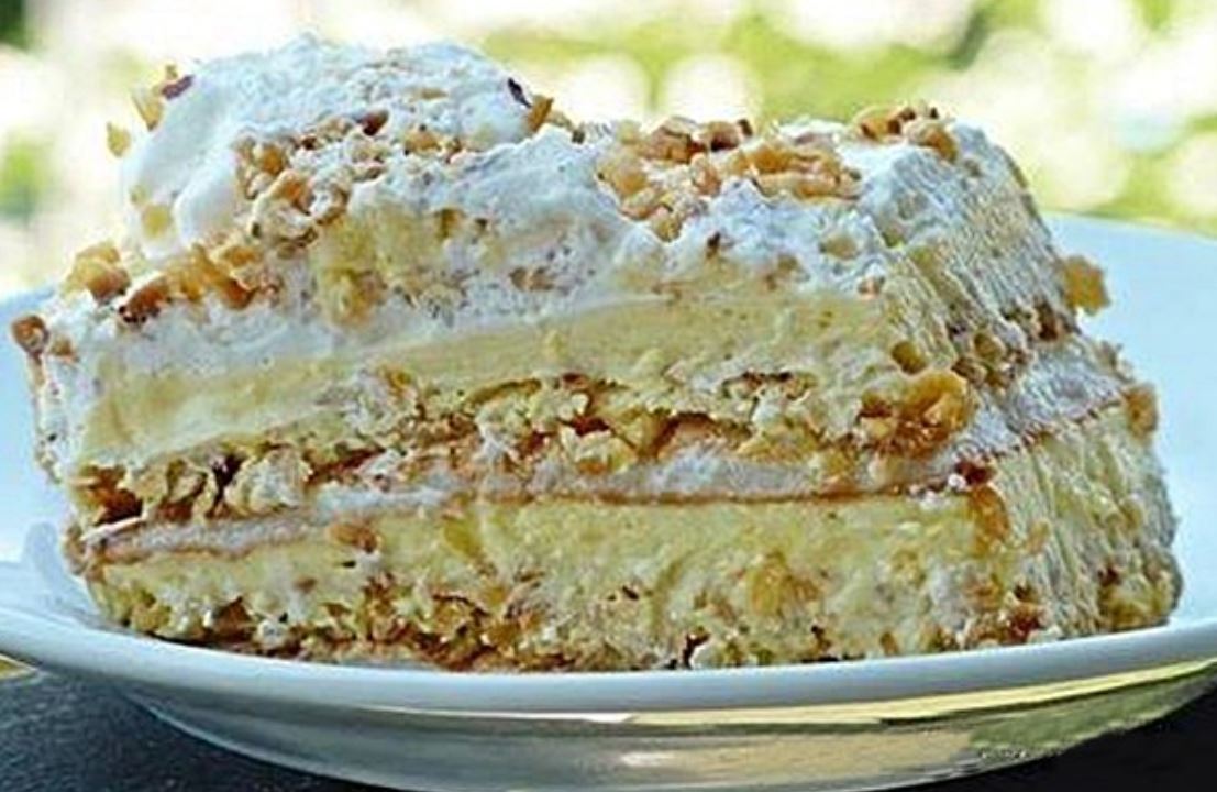 i sve premazati umućenim šlagom i posuti krupno rezanim orasima.