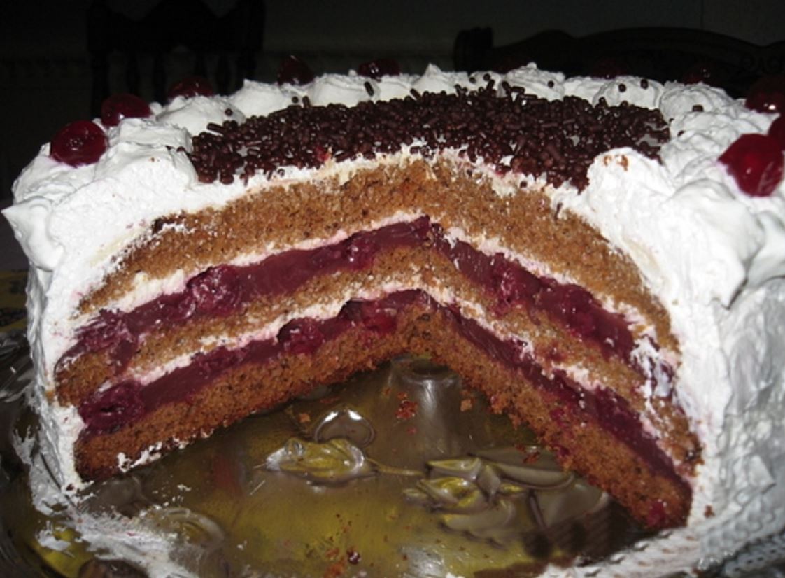 Rasporediti pola parfe kreme, drugi sloj biskvita, drugu polovicu kreme od višanja i parfe kreme te poklopiti trećim dijelom biskvita.