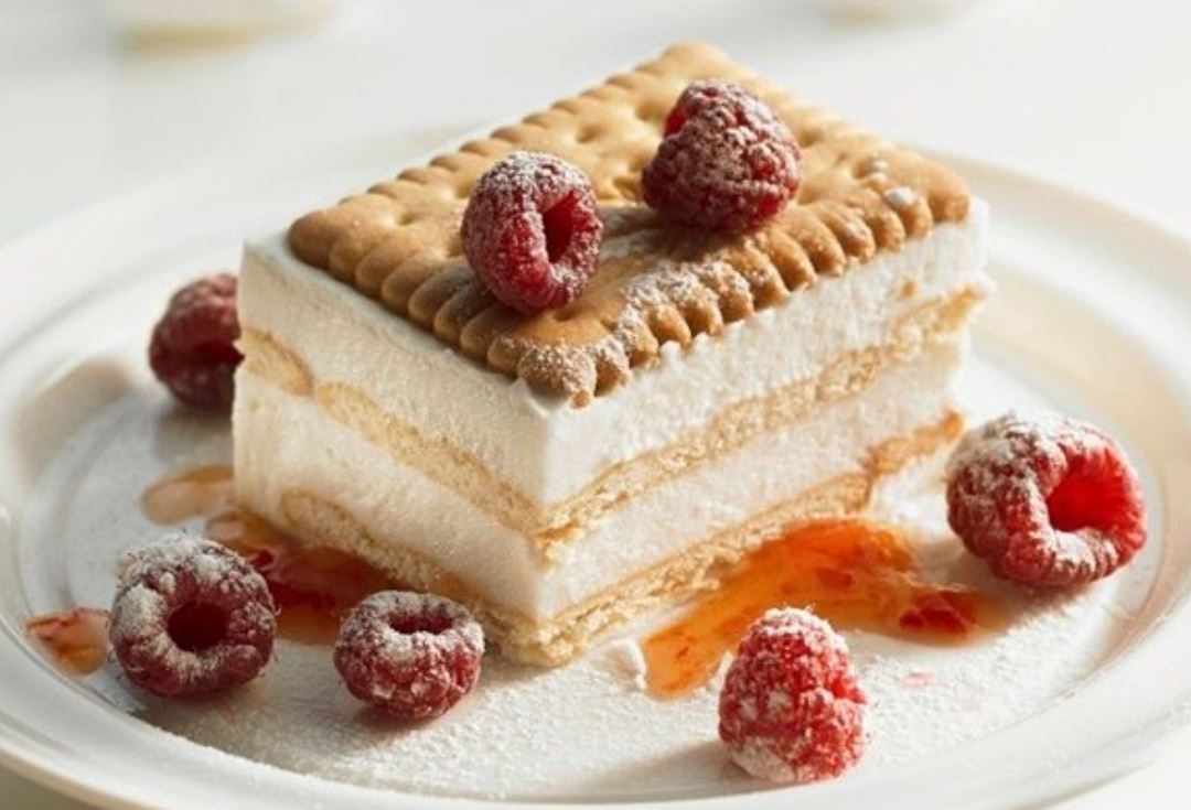 Ređajte dok imate fila. Završite sa keksom, premažite šlagom, ukrasite mrvicama i prelivom od borovnice.