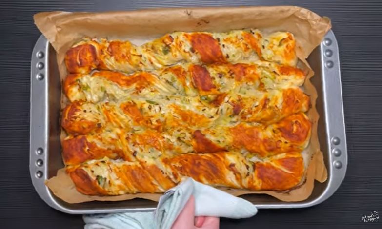 Kada je testo nadošlo, svaku od loptica razvući oklagijom na ovalne tanke kore. Zatim uzeti jednu koru i premazati je posnim margarinom a zatim nafilovati celu premazanu površinu filom. Poklopiti drugom razvučenom korom i taj postupak ponavljati do poslednje kore. Poslednju koru ne premazivati, rukama pritisnuti krajeve i oblikovati testo u pravougaoni oblik. Potom seći filovano testo na štapiće debljine oko 3cm. Svaki od štapica blago uviti i postaviti u pleh za pečenje. Kada ste formirali uvrnute štapiće od svog preostalog testa, potrebno ih je premazati smasom od jedne kašike margarina i malo crvene paprike. Peći 10 minuta na 250°C, a zatim smanjiti temperaturu na 200°C i peći još nekih 20ak minuta. Izvaditi iz rerne i sačekati da se malo prohladi.