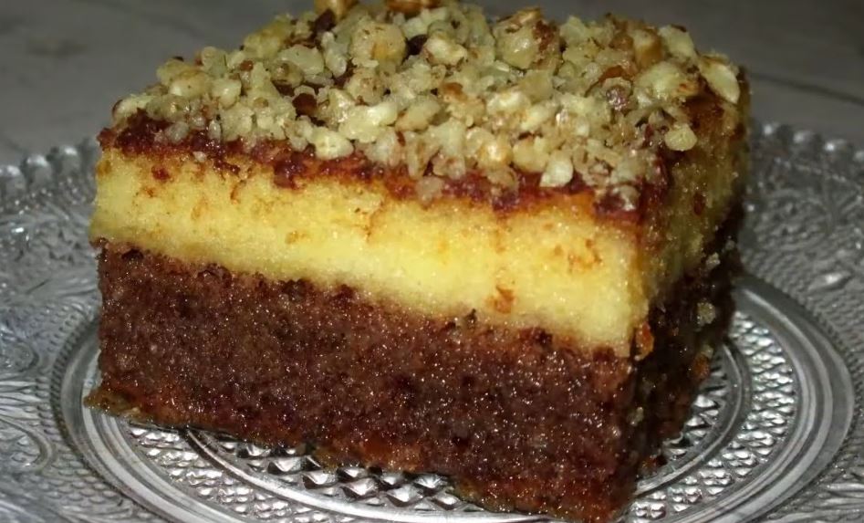 2. testo: Umutiti jaja sa šećerom, dodati brašno i griz i sve lepo sjediniti. Sipati na polupečeno, prvo testo i ispeći kolač.