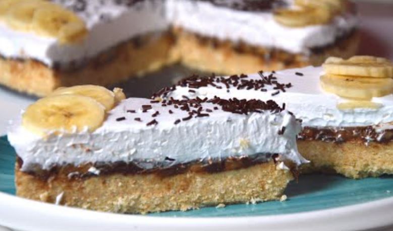 Preko staviti bananu koju ste isekli na kolutiće, te preliti smesom od čokolade koju ste istopili sa mlekom i uljem.