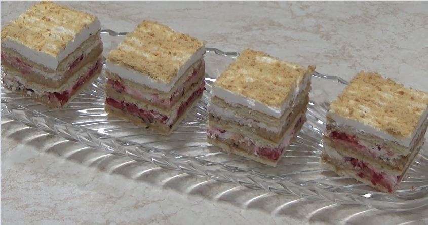 U pleh složiti prvi sloj keksa natopljenog mlekom. Preko keksa premazati polovinu prvog fila. Preko prvog fila staviti polovinu malina. Preko malina premazati polovinu umućene slatke pavlake. Potom poređati drugi sloj keksa natopljenog mlekom. Premazati keks drugom polovinom prvog fila. Posuti ostatkom malina i premazati ostatkom šlaga. Zatim složiti poslednji, treći red keksa umočenog u mleko.