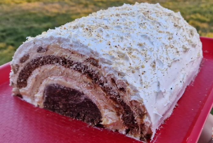 – 200 ml mleka – mleko, margarin, čokoladu i šećer istopiti na laganoj vatri pa sjediniti sa orasima i keksom…. formirati rolat veličine kore na tabli za tortu.
