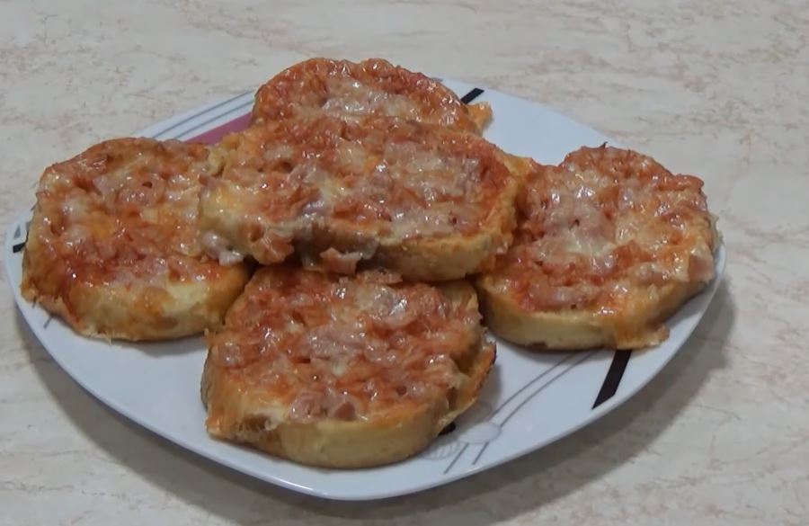 Priprema: Umutiti jaja, pa posoliti i dodati mleko. Hleb umočiti u jaja pa staviti u pleh na papir za pečenje. Svaku krišku posuti šunkom.