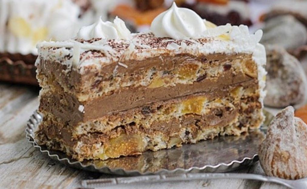 Pomiješati brašno, mljeveni keks i prašak za pecivo pa dodati u snijeg, miješati lopaticom, a ne mikserom. Istresti mljevene orahe i suho voće pa sve fino ujednačiti.
