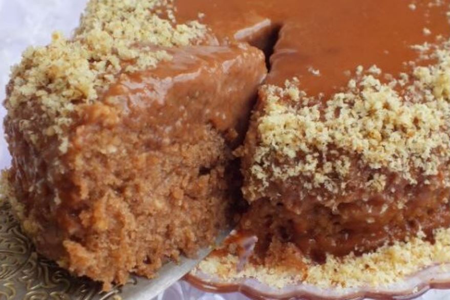 Kada je torta gotova sačekajte par minuta a potom je bukvalno izvrnite na tanjir i prelijte slatkom pavlakom i čokoladom . Ukrasiti mlevenim orasima
