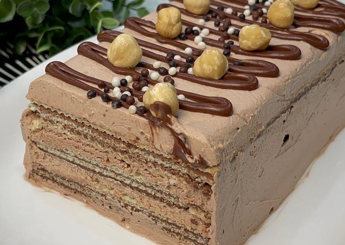 Sipajte prvi deo fila, pa poravnajte, pa poređajte napolitanke. Zatim nastavite tako dok ne utrošite sve sastojke, a poslednji red treba da bude fil. Pokrijte i stavite u zamrzivač na 2 sata. Ako želite ukrasite nutelom i lešnicima.