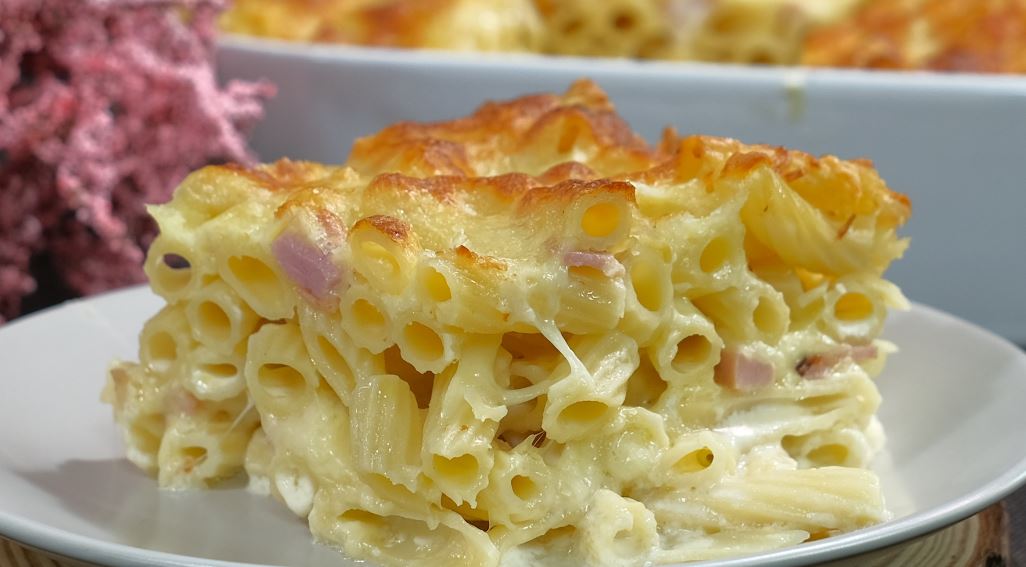Priprema: Skuvajte makarone, pa procedite i prelijte maslinovim ulje. Dobro promešajte. U drugoj posudi umutite jaja koja ste posolili, pa dodajte mleko i jogurt. Dobro sjedinite. Šunku i slaninu iseckajte, pa propržite u tiganju. Zatim tepsiju nauljite i pospite prezlama, pa prospite višak. Poređajte pola količine makarona, preko stavite pola količine propržene šunke i slanine, pa pospite pola količine rednane fete i tvrdog sira.