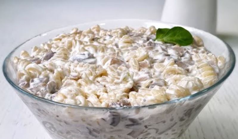 Na srednjoj temperaturi na 2-3 kašike ulja prodinstati sitno seckan praziluk. Do se luk dinsta očistite šampinjone i isecite na sitnije komade. Nakon 10-ak minuta dinstanja luka dodajte i šampinjone, 1/4 kašičice soli, suvi začin, origano, biber i dinstati još 10-15 minuta dok voda koju su pustili šampinjoni ne ispari. Šampinjone dodati u oceđene makarone, promešati i poklopljeno ostaviti da se potpuno ohladi (1h). Na svakih 15-ak minuta protresite šerpu tako da se makarone rasture. Tako ćete sprečiti njihovo lepljenje. Ukoliko to budete radili kašikom postoji šansa da će se makarone malo izgnječiti.
