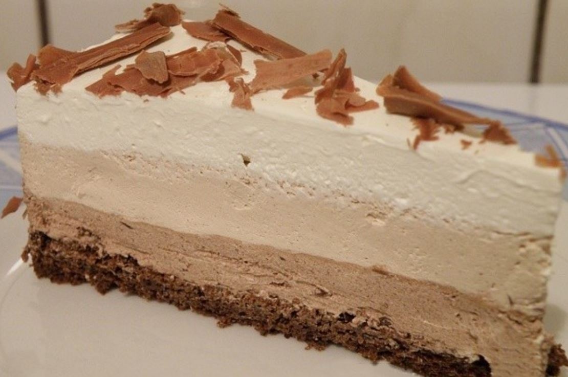 Svaku od čokolada otopiti na pari u 100 ml vrhnja, ohladiti u frižideru i nakon toga umutiti u čvrste kreme. Prvo nanijeti tamnu kremu, zatim svijetliju i odozgo bijelu. Ukrasiti čokoladnim “kovrdžicama”.