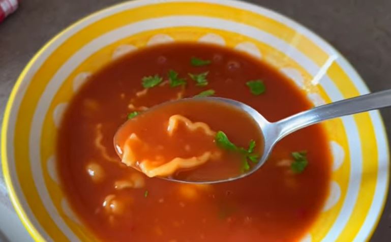 U čaši vode dooobro razumutiti kašiku i po brašna. Najbolje mutilicom zbog grudvica. Zatim to dodati u 300ml vode koje se već kuvala na šporetu. Sve dobro umešati da se ne stvore grudvice. Dodati 500ml kuvanog paradajza i začiniti (ako već nije) origanom, bosiljkom, morskom solju i sa malo sirćeta ili limunovog soka (može i pri posluženju). Naliti sve vodom do vrha (moj lončić ima 2l ukupno) pa dodati testeninu po želji i kuvati oko 8-10 min. Služiti toplo.
