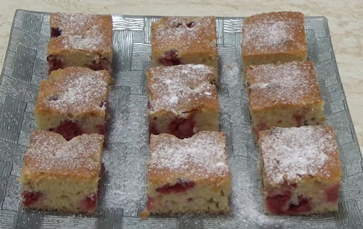 Kolač peći u zagrejanoj rerni na 180 stepeni od 30 do 35 minuta. Kad se kolač ohladi, iseći na kocke i posuti prah šećerom.