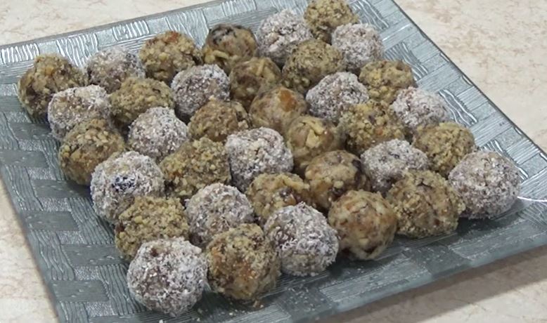 Od smese praviti kuglice veličine oraha i valjati ih u kokosovo brašno ili mlevene orahe.
