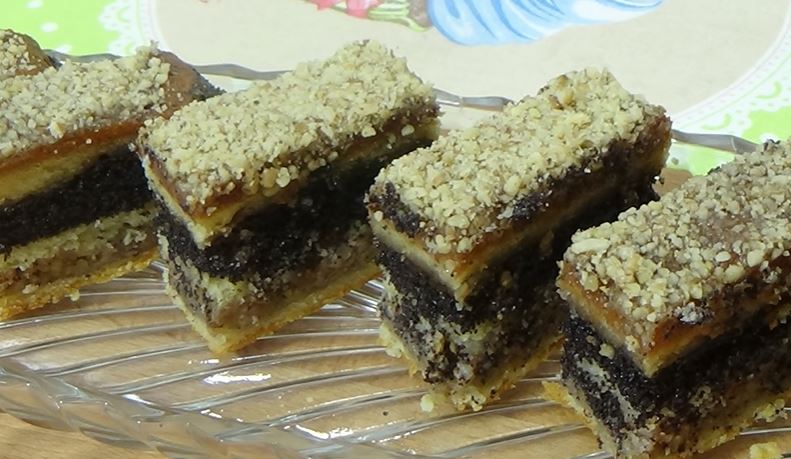 Ispečen kolač prevrnite na nekom platou pa još topao premažite džemom i posipajte mlevenim orasima.