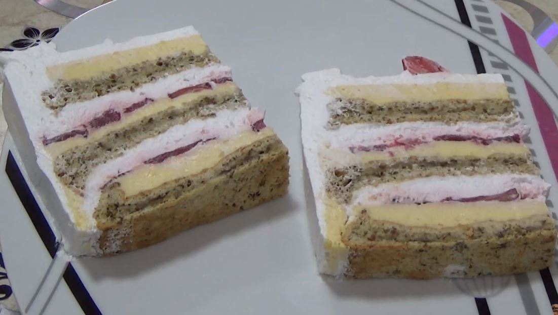 Umutiti belanca. Postepeno dodavati šećer i mutiti. Dodati brašno i orahe i umešati špatulom. Pleh veličine 24×34 obložiti papirom za pečenje i izručiti smesu za koru. Koru staviti u zagrejanu rernu na 200 stepeni da se peče od 15 do 20 minuta. Treba napraviti još dve ovakve kore.