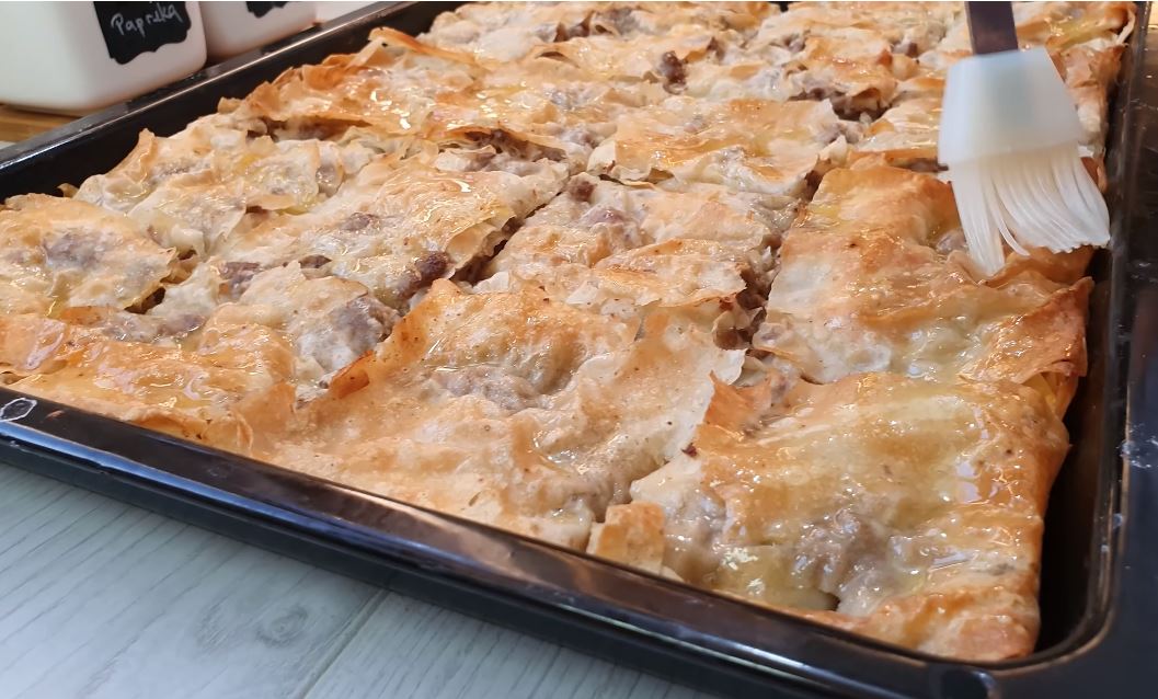 Jufke namočiti u vruću vodu i nastaviti slagati u slojevima, do vrha tepsije : jufka – meso – smjesa sa mlijekom
