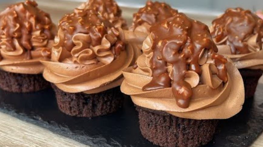 Pecite u zagrejanoj rerni na 170°C oko 20-25 minuta. Izdubite vrh na mafinima, pa napunite karamel kremom. Otopite slatku pavlaku sa čokoladom (70 ml), a maskarpone umutite sa slatkom pavlakom (30 ml) i šećerom u prahu. Dodajte istopljenu čokoladu u beli fil i umutite mikserom. Ukrasite mafine, pa stavite u frižider na sat vremena. Za to vrem otopite čokoladu sa mlekom i uljem, pa dodajte sekcani kikiriki. Dobijenom smesom dodatno ukrasite mafine.